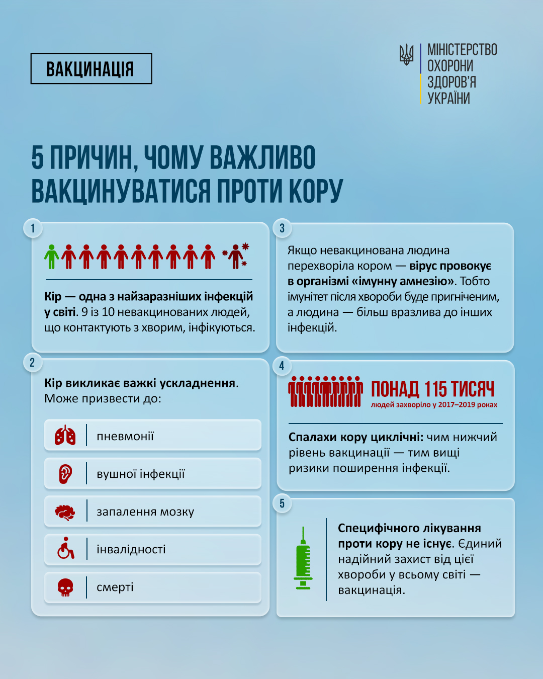 🔸Кір має важкі ускладнення: може призвести до пневмонії, вушної інфекції (отит), запалення мозку, в деяких випадках до інвалідності та смерті.