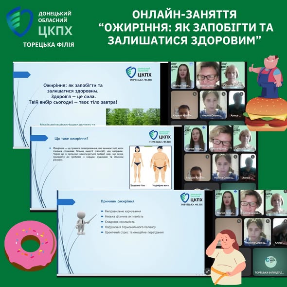 Для підвищення обізнаності підлітків щодо проблеми ожиріння фахівці Торецької філії провели онлайн-заняття для учнів 6–7 класів ЗЗСО №3 на тему: «Ожиріння: як запобігти та залишатися здоровим», доповнене порадами сімейного лікаря.
