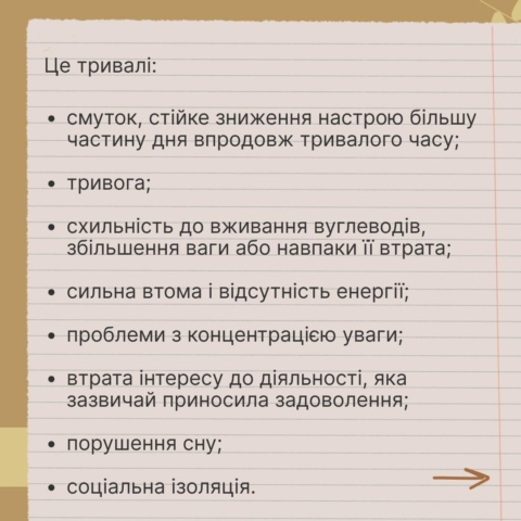 «Дзвіночки», які сигналізують про нього, — це тривалі втома, пригніченість, зниження інтересу до повсякденних справ, надмірний сон та зміна апетиту. А також ознаки зі списку в каруселі 👇.