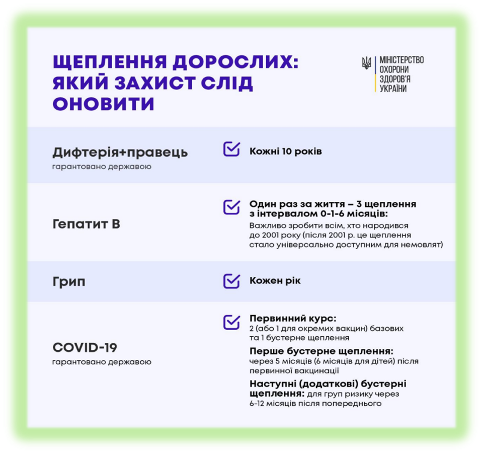 «Імунізацію призначено не лише для дітей. Захист від деяких вакцин, введених у дитячому віці, може з часом знижуватись. Ви також можете піддаватися ризику певного вакцинокерованого захворювання через свій вік, професію, спосіб життя, подорожі чи стан здоров’я. Всі дорослі потребують імунізації для попередження серйозних захворювань, які можуть призвести до порушення стану здоров’я, тимчасової втрати працездатності та фінансових збитків.» – Євгенія Правдюк, експертка Національного порталу з імунізації.