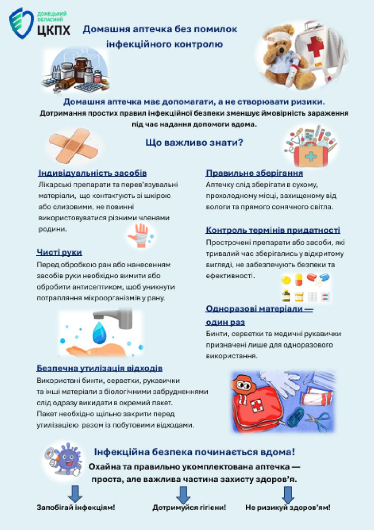 Дотримання простих правил інфекційного контролю в домашній аптечці допомагає зменшити ризик захворювань і зробити лікування безпечним. Інфекційна безпека починається з уважного ставлення до дрібниць навіть у повсякденному побуті.