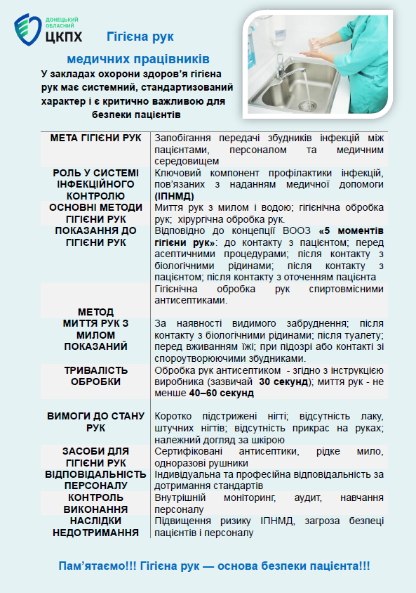 Систематичне дотримання гігієни рук знижує ризик інфекцій, пов’язаних з наданням медичної допомоги, поширення антибіотикорезистентних збудників і забезпечує безпеку як пацієнтів, так і медичного персоналу.