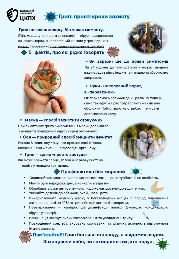 Профілактика грипу ґрунтується на щоденних, простих кроках і відповідальному ставленні до власного здоров’я та здоров’я оточуючих. Захищаючи себе, ми зменшуємо ризик для тих, хто поруч — у родині, на роботі, у громаді.