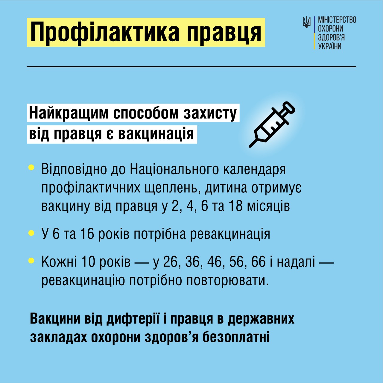 Єдиний спосіб профілактики правця – це вакцинація. І щеплюватись потрібно не тільки дітям, а й дорослим! Ефективність вакцинації від правця (за умови отримання повного курсу щеплень) сягає 100%.