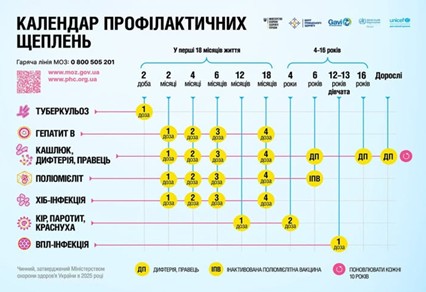 - Поліомієліт (ІПВ) — 5 доз (2, 4, 6, 18 міс. і 6 років).