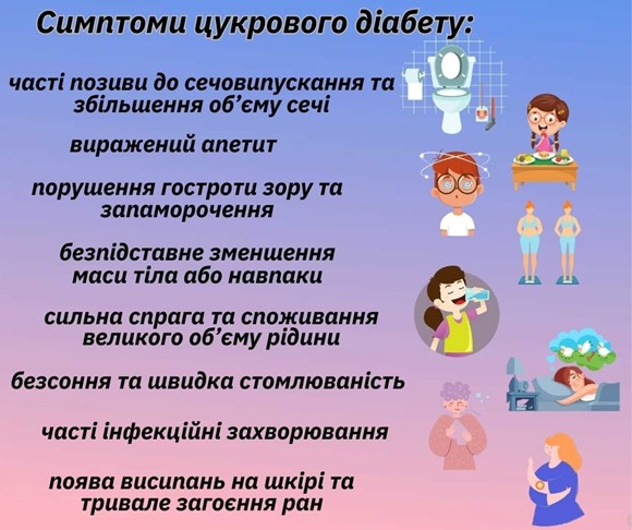 Цукровий діабет дуже підступний та небезпечний, тому що має тривалий безсимптомний перебіг. В цей період людина навіть не підозрює про те, що хвора, та веде звичний для себе спосіб життя. Саме тому, кожен має знати певні прояви даного захворювання, аби вчасно виявити недуг та прийняти належні заходи. Запідозрити патологію можливо за наступними ознаками: