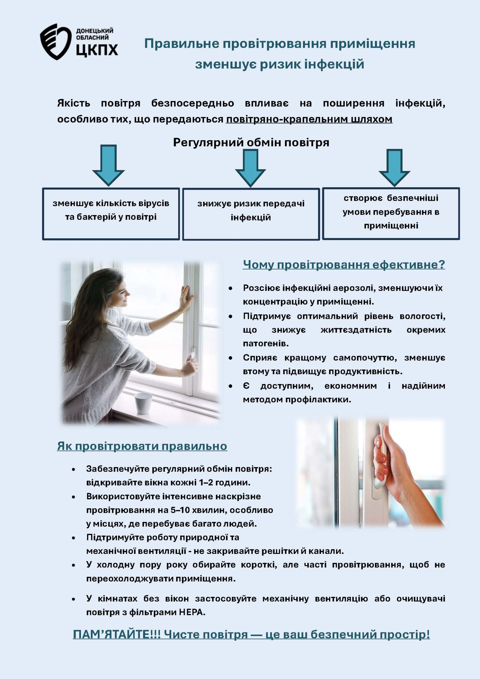 ℹ️У приміщеннях, де постійно перебувають люди, швидко накопичуються волога, пил, вуглекислий газ та мікроби. Без належного обміну повітря ці фактори створюють сприятливі умови для поширення респіраторних інфекцій: ГРВІ, грипу, COVID-19 та інших. Саме тому регулярне та правильне провітрювання є одним із найпростіших і водночас найефективніших заходів інфекційної безпеки.