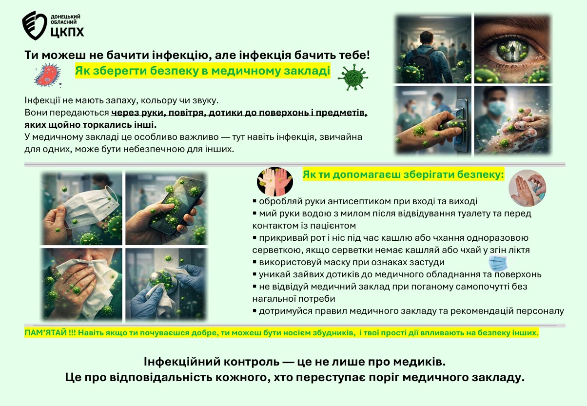 🧬Збудників інфекційних хвороб не видно неозброєним оком, але вони завжди поруч. Вони поширюються через руки, предмети, повітря та поверхні, до яких торкається багато людей. Дотримання простих правил знижує ризик передачі збудників і робить перебування у медичному закладі безпечнішим для всіх.