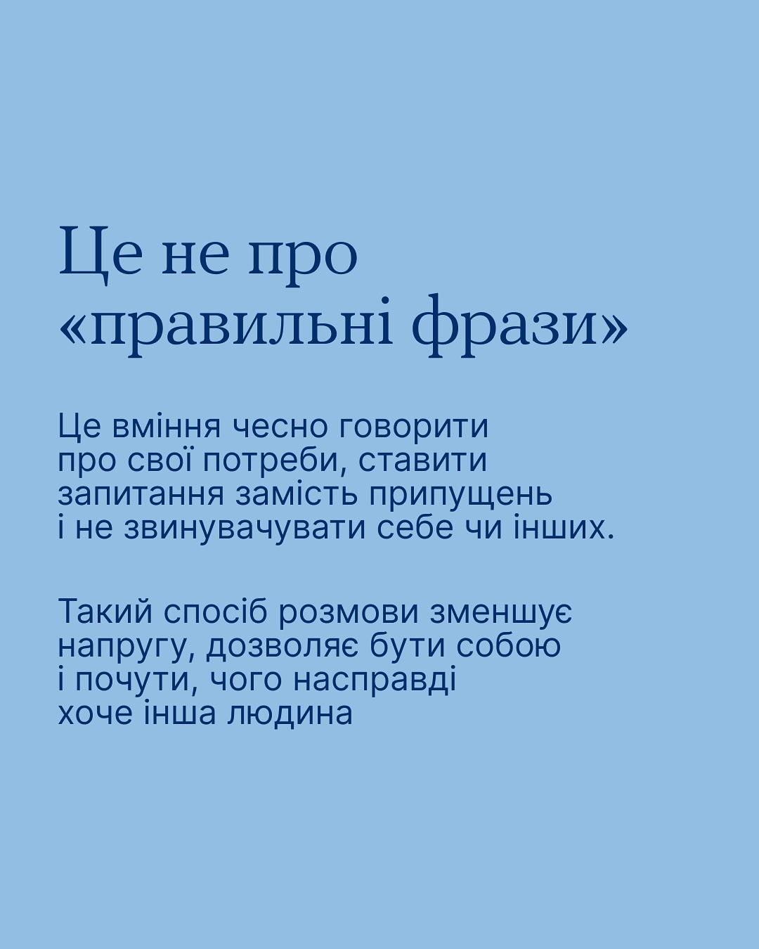 Здатність пояснювати свої потреби та перевіряти припущення, не звинувачуючи себе чи інших, зменшує напругу й допомагає краще розуміти одне одного