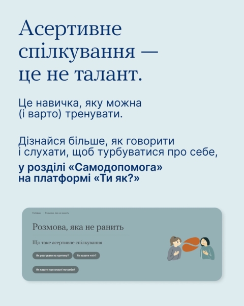 Дізнайся в каруселі 👇, що таке асертивне спілкування. Та переходь у розділ «Самодопомога» на платформі «Ти як?», щоб прочитати більше.