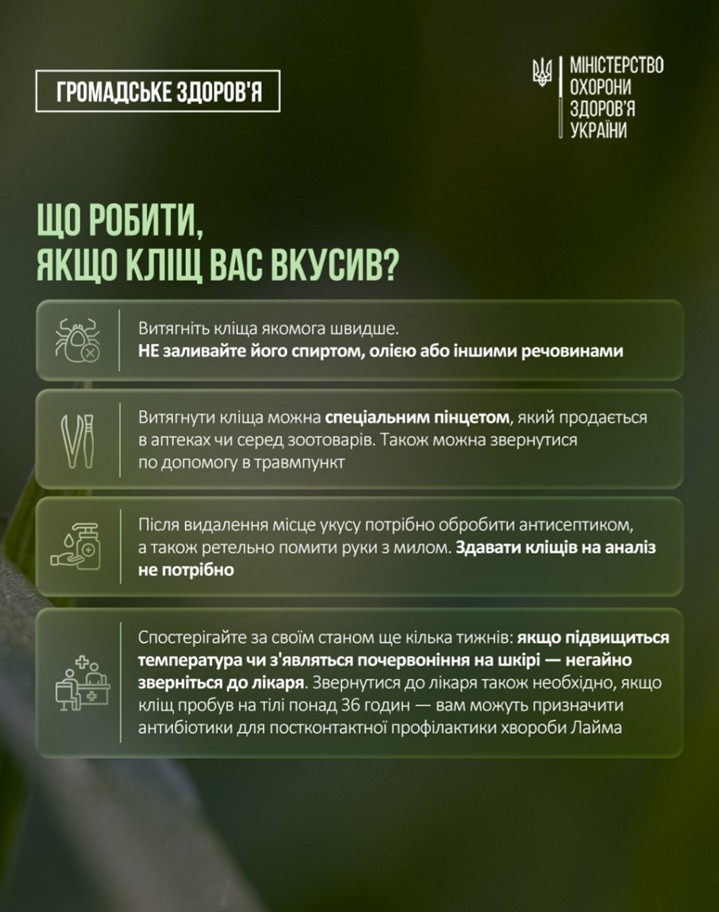 🌿З настанням теплих днів усе більше людей вирушають на природу — до лісу, парків, на пікніки. Саме цей час в Україні характеризується періодом підвищеної активності кліщів. За даними Центру громадського здоров’я МОЗ, пік активності припадає саме на квітень-червень та вересень-жовтень.