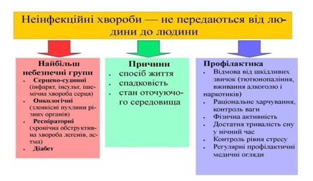 Виділяють 4 основні типи неінфекційних захворювань – це серцево-судинні захворювання (наприклад, інсульт та інфаркт), рак, хронічні респіраторні захворювання (наприклад, хронічна обструктивна хвороба легень та астма) і діабет.