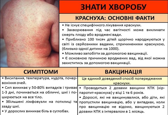 Краснуха — це високозаразне вірусне захворювання, що передається повітряно-краплинним шляхом і характеризується дрібним рожевим висипом збільшенням лімфовузлів та легкою гарячкою. Найнебезпечніша для вагітних (ризик вад плода)але зазвичай легко протікає у дітей. Єдиний надійний захист — вакцинація КПК