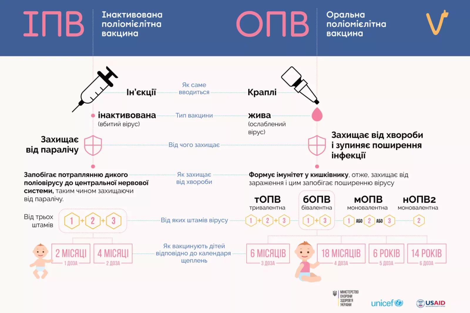 Для захисту проти вірусу поліомієліту в Україні використовують два типи вакцин: інактивовану (ІПВ), що вводиться у вигляді ін’єкцій, та оральну (ОПВ), яку дають у вигляді крапель у рот. Краплі формують імунітет у кишківнику дитини, тим самим зупиняють поширення інфекції. Кожна дитина до досягнення 14 років має отримати шість доз вакцини проти поліо. Так можна сформувати імунітет до захворювання.