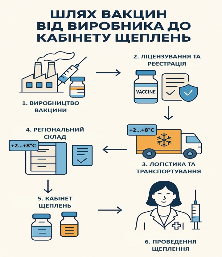 Перед тим, як вакцина потрапить до медичних закладів, вона проходить державну реєстрацію та перевірку відповідними органами охорони здоров’я. В Україні за це відповідає Державний експертний центр Міністерства охорони здоров’я України. Усі дані про умови зберігання перевіряються, а обладнання, що використовується для транспортування і зберігання, має бути сертифікованим. Тільки після ретельної перевірки на відповідність, вакцина може рушати до медичних закладів. Вакцини дуже чутливі до температури, тому їх транспортують до наступного пункту у спеціальних термоконтейнерах і холодильних установках, які безперервно забезпечують необхідну температуру.