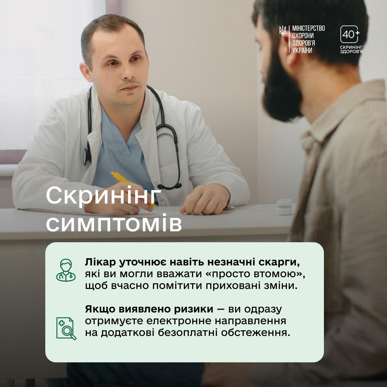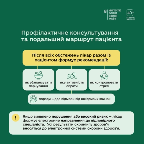 🟢Саме з цією метою і створено програму Скринінг здоров’я 40+, що базується на засадах доказової медицини та найкращих європейських практиках. Вона дає можливість безоплатно перевірити стан організму, оцінити індивідуальні ризики та спільно з лікарем визначити план дій для збереження вашого здоров’я.