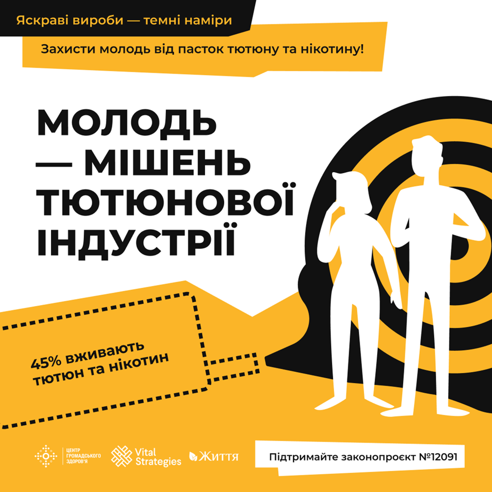 Усе це — частина продуманої маркетингової стратегії, яка справді працює: 45%** молодих українців вживають тютюнові або нікотинові вироби. Молодь часто не усвідомлює всіх наслідків куріння, тож саме сильне антитютюнове законодавство має її захистити.