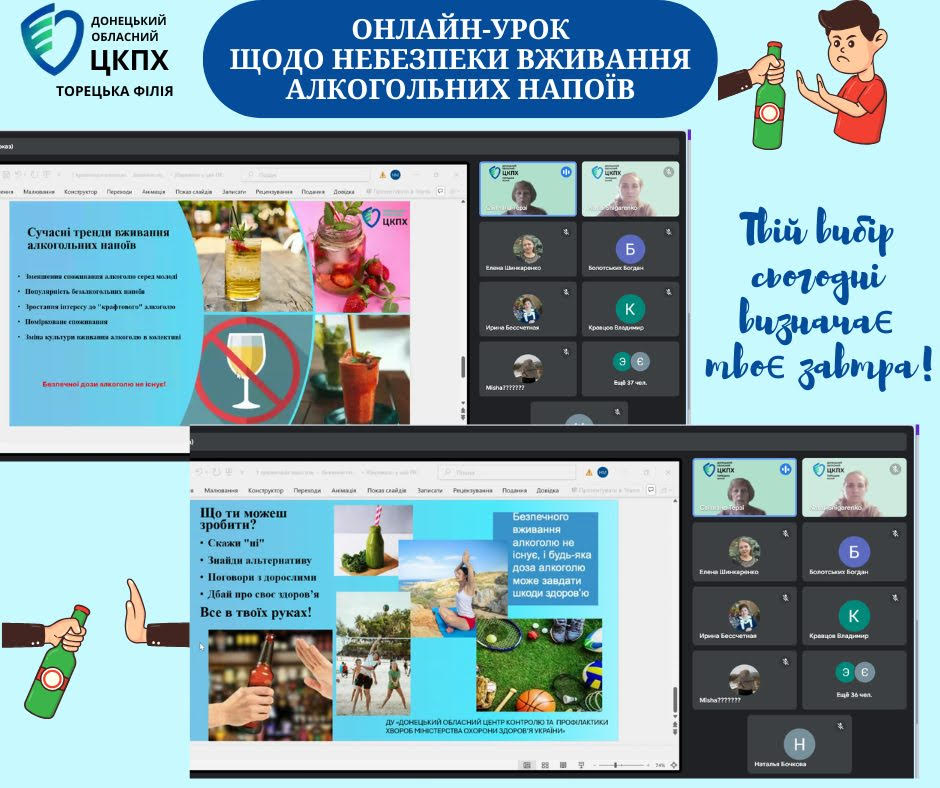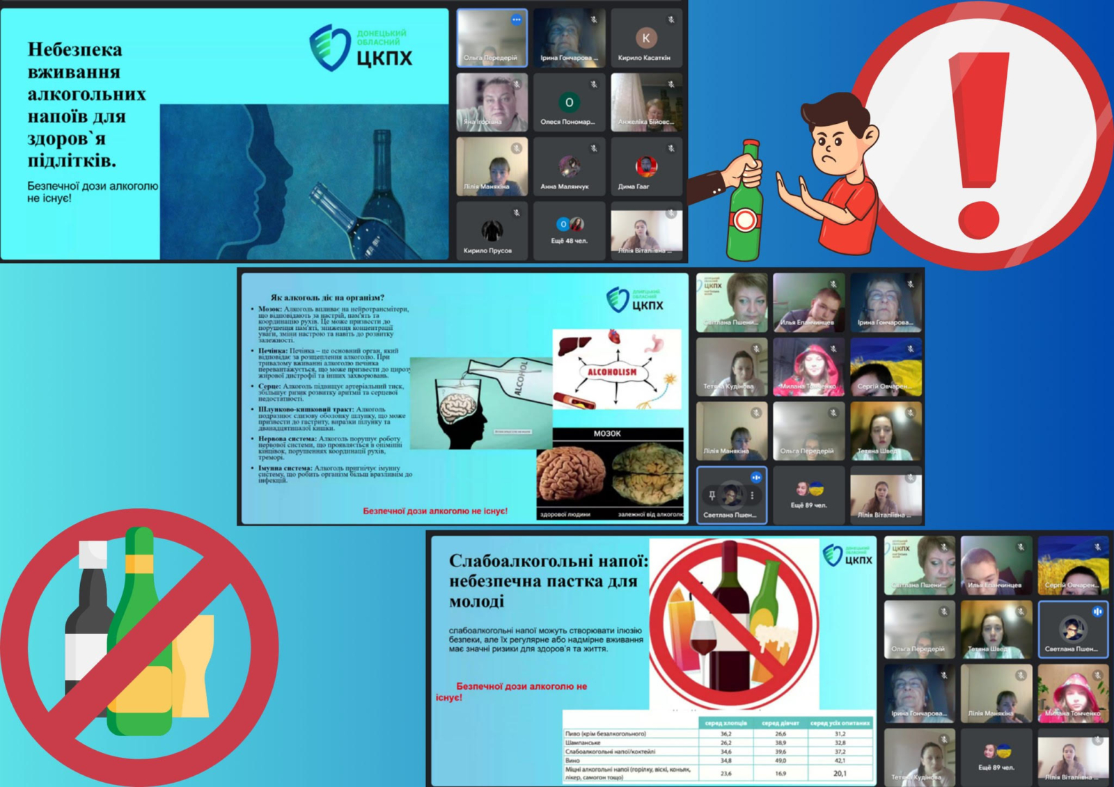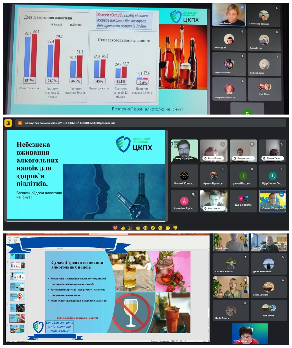 У листопаді та грудні 2024 року фахівці філій ДУ «ДОНЕЦЬКИЙ ОЦКПХ МОЗ» провели інформаційні уроки, присвячені шкідливому впливу алкоголю на організм підлітків у 115 закладах загальної середньої освіти Донецької області для учнів 8-11 класів, на яких розкрили всі аспекти цієї важливої проблеми.