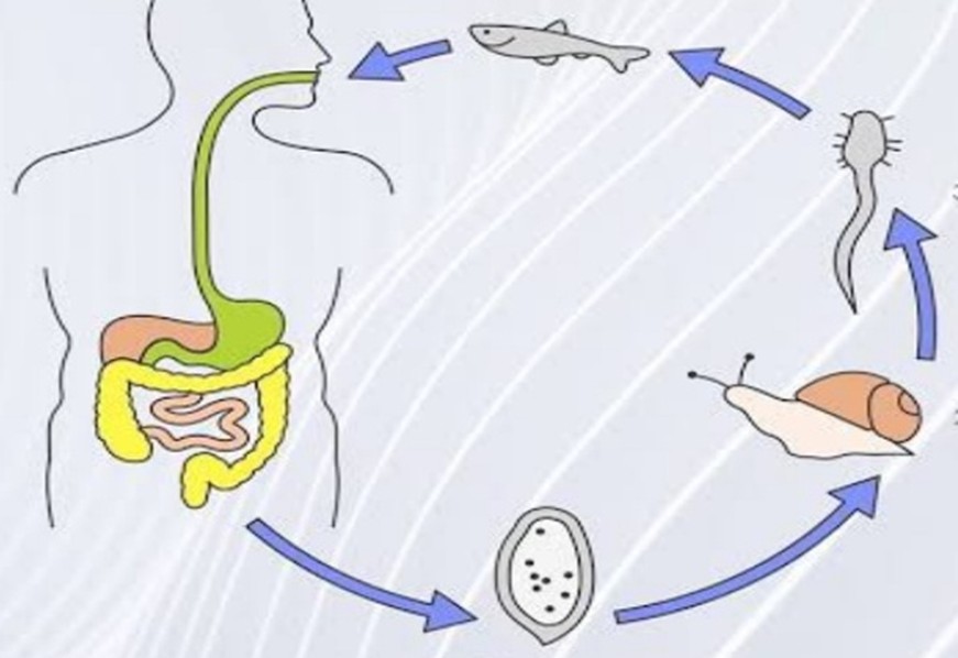Паразити виділяють велику кількість яєць, які після проходження через шлунково-кишковий тракт, разом із фекаліями виділяються в зовнішнє середовище. Яйця паразита стійкі до висихання та морозів. Під час дощів, з талими та паводковими водами яйця попадають у прісні водоймища, де продовжується цикл їх розвитку, спочатку в організмі проміжного хазяїна – молюска, а потім в організмі додаткового хазяїна – риби родини коропових.