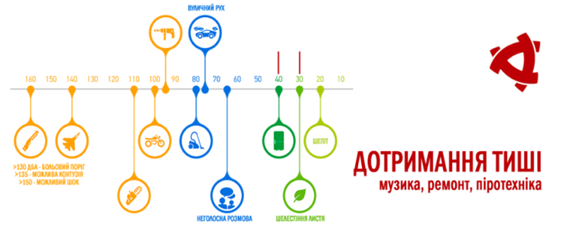 ✅вживати заходів щодо недопущення впродовж доби перевищень рівнів шуму, встановлених санітарними нормами, в таких приміщеннях і на таких територіях (захищені об’єкти):