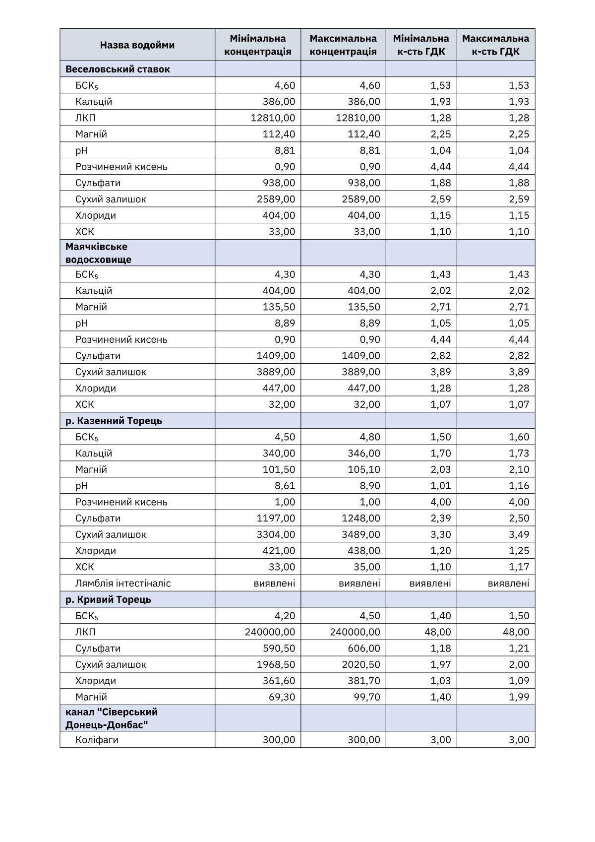 ℹ️Виходячи з вищевикладеного можливо констатувати, що якість води вищезгаданих водних об’єктів, за виключенням р. Сіверський Донець, не може використовуватися для оздоровчих, рекреаційних та спортивних цілей, зокрема для купання та риболовства. Використання такої води може призвести до ризику виникнення інфекційних захворювань, різноманітних захворювань статевих органів, шкіри, ураження рогівки ока, виникнення запальних процесів в організмі людини тощо.