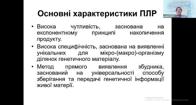 Чернишова Лора, фахівець з лабораторій Бюро ВОЗ в Україні, докладно і цікаво розповіла про основи ПЛР, методи екстракції нуклеїнових кислот, методи детекції продуктів ампліфікації, контроль якості в ПЛР-лабораторії.
