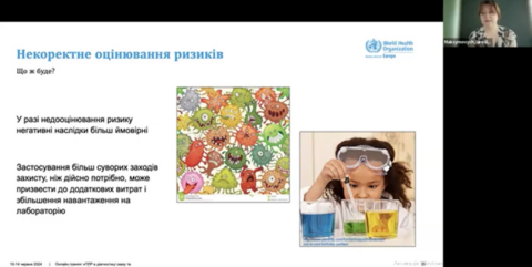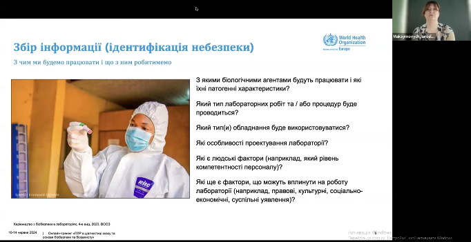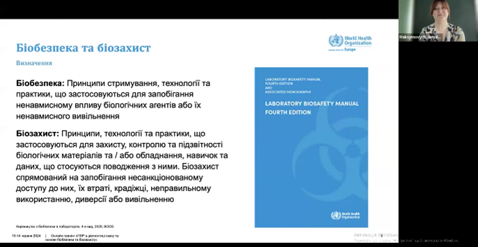 Експерт з біобезпеки та біозахисту Бюро ВОЗ в Україні Максимович Ярослава висвітила наступні актуальні теми: біобезпека та біозахист; управління біологічними ризиками; правильні мікробіологічні практики та процедури; ізолювальне обладнання; засоби індивідуального захисту, деконтамінування.