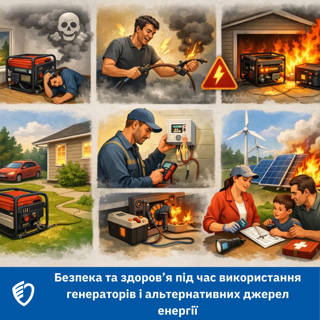 Генератори та альтернативні джерела енергії — корисні та необхідні пристрої у сучасному побуті, але їх безпечне використання безпосередньо впливає на здоров’я і життя людей. Дотримання простих правил експлуатації, контроль за станом обладнання та уважність до сигналів небезпеки допомагають уникнути отруєння, пожеж та травм.