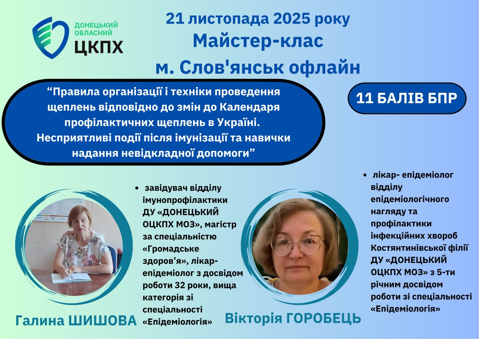 📅21 листопада 2025 року в місті Слов’янську Донецької області для медичних працівників Донецької області відбудеться майстер-клас на тему: «Правила організації і техніки проведення щеплень відповідно до змін до Календаря профілактичних щеплень в Україні. Несприятливі події після імунізації та навички надання невідкладної допомоги»