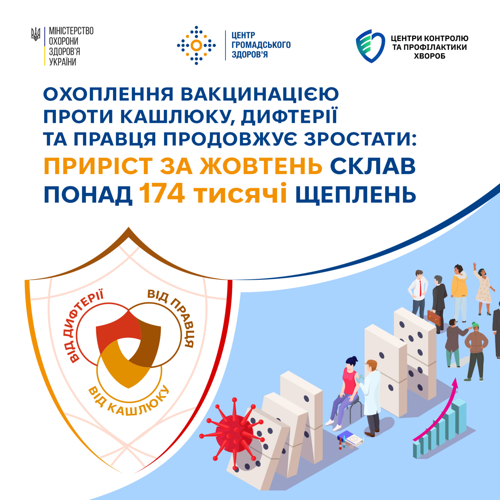 ✅Охоплення вакцинацією проти кашлюку, дифтерії та правця продовжує зростати: приріст за жовтень склав понад 174 тисячі щеплень.