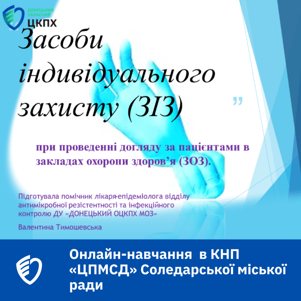 📅05.05.2025 фахівцем відділу антимікробної резистентності та інфекційного контролю ДУ «ДОНЕЦЬКИЙ ОБЛАСНИЙ ЦЕНТР КОНТРОЛЮ ТА ПРОФІЛАКТИКИ ХВОРОБ МІНІСТЕРСТВА ОХОРОНИ ЗДОРОВ’Я УКРАЇНИ» був проведений навчальний онлайн-вебінар на тему: «Засоби індивідуального захисту (ЗІЗ) при проведенні догляду за хворими в закладах охорони здоров’я» для медичних працівників КНП «ЦПМСД» Соледарської міської ради.