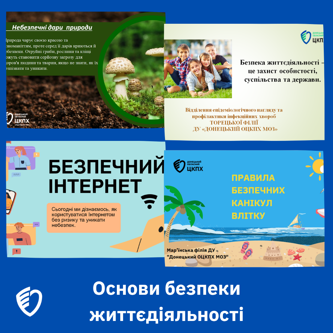 Фахівцями філій ДУ «ДОНЕЦЬКИЙ ОЦКПХ МОЗ» підготовлено 10 інформаційних матеріалів з актуальних питань – «Мінно-вибухові травми та опіки: як допомогти?», «Крути педалі з розумом: прості правила для дітей», «Побутові небезпеки – електрика», «Побутові небезпеки – газ», «Скажи ні травматизму», «Безпечний рух – справа кожного», «Гаджети й дорога – небезпечне поєднання», «Безпечне дозвілля на природі» та інші . Крім того, фахівцями філій розроблено 4 презентації – «Небезпека в лісі», «Безпечний інтернет», «Безпека життєдіяльності – це захист особистості, суспільства та держави», «Правила безпечних канікул влітку», які розміщені на інформаційних ресурсах 91 закладу освіти, та 16 пам`яток за тематикою безпеки життєдіяльності.