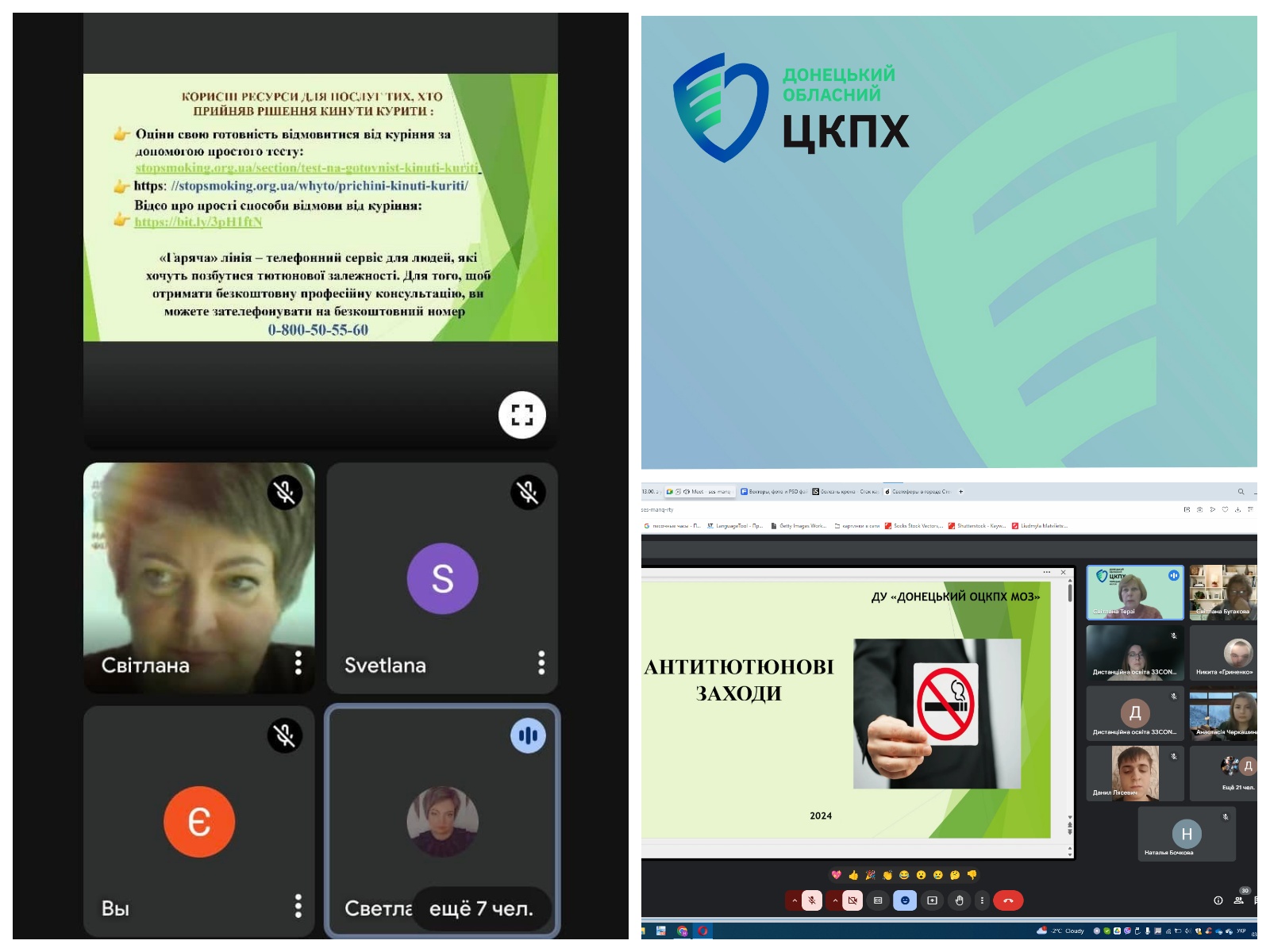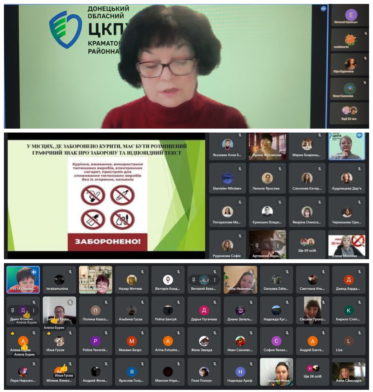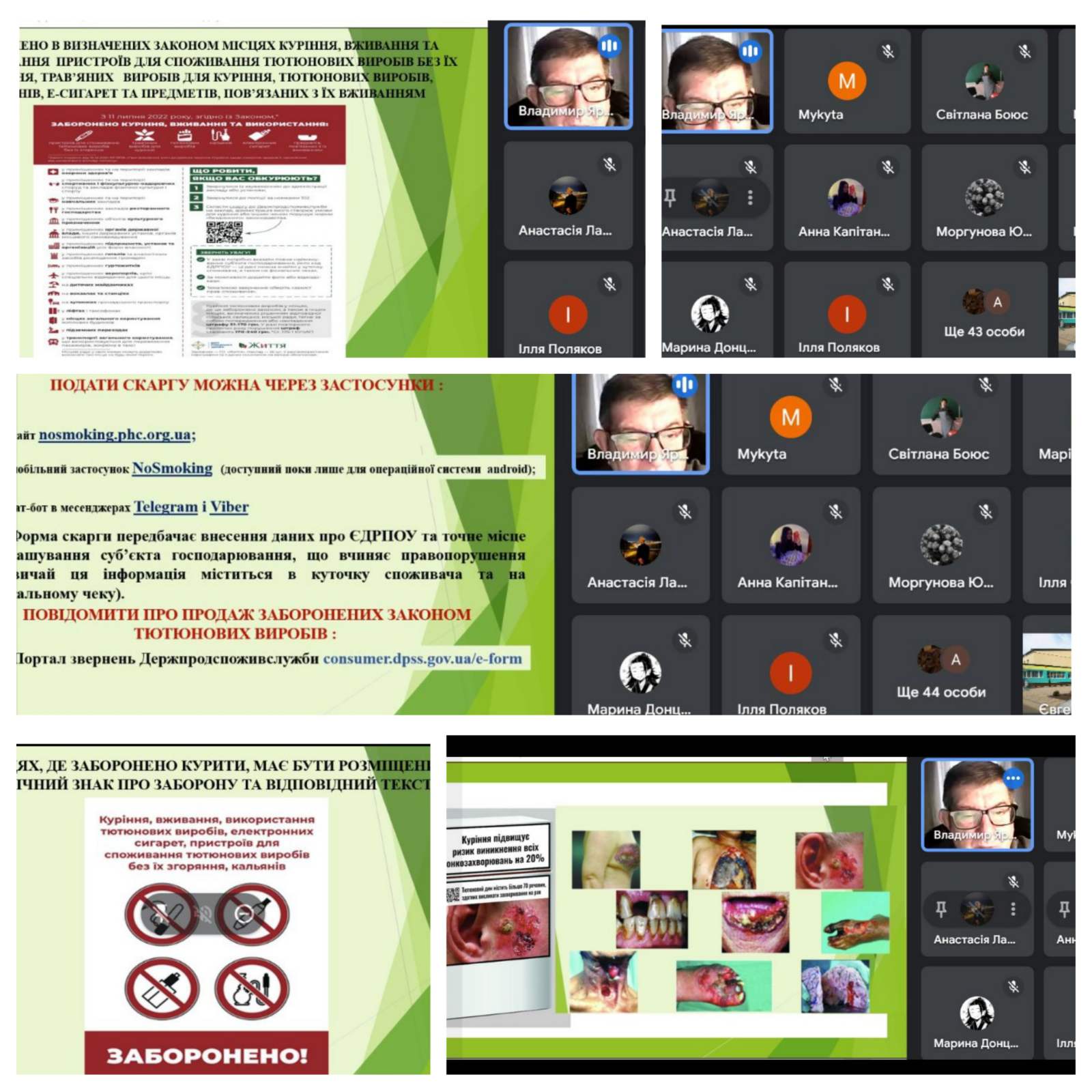 Протягом грудня на сайтах навчальних закладів, їх сторінках у Facebook, у Вайбер-групах класів були розміщені 3 інформаційні статті («Право на бездимне 💨 середовище гарантовано законами України», «Що шкідливіше пасивне чи активне куріння», «Профілактика та лікування залежності від тютюну (нікотинової залежності)», 4 інформаційні картинки («Чому варто кинути курити», «Хочеш мати гарний вигляд? Кидай курити!», «Я кидаю курити» та «Як допомогти курцю»), 2 відеоролика («Відмовитися від куріння можливо» та «Stop-smoksng»). Також, здобувачі освіти створювали плакати з профілактики тютюнопаління на підставі картинок та ключових повідомлень, наданих фахівцями ДУ «ДОНЕЦЬКИЙ ОЦКПХ МОЗ».