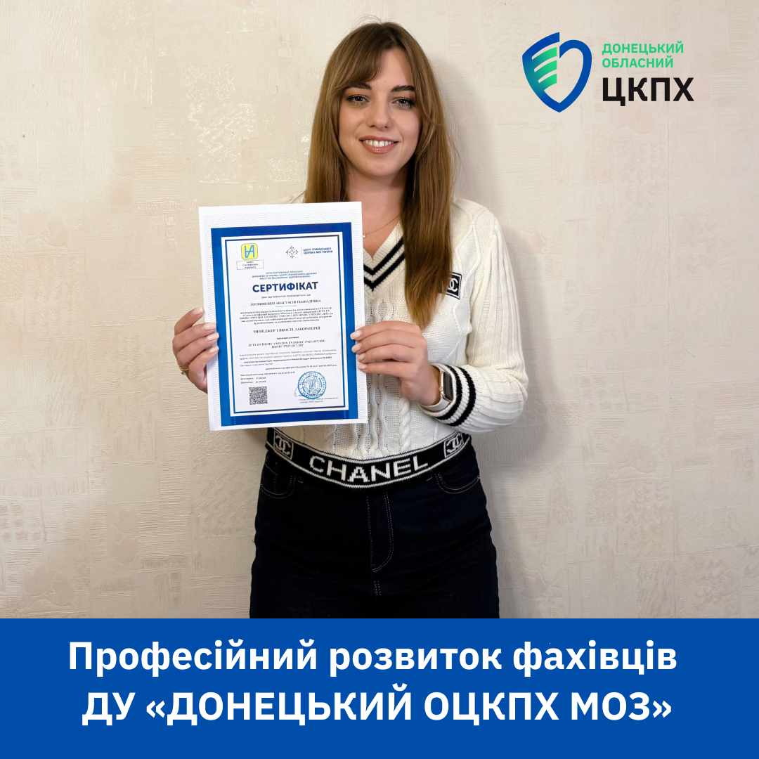 ✅Завідувач санітарно-гігієнічної лабораторії ДУ «ДОНЕЦЬКИЙ ОЦКПХ МОЗ» — Анастасія Геннадіївна Логвиненко — успішно пройшла сертифікацію відповідно до вимог міжнародного стандарту ДСТУ EN ISO/IEC 17025:2019 та підтвердила свою високу професійну компетентність.