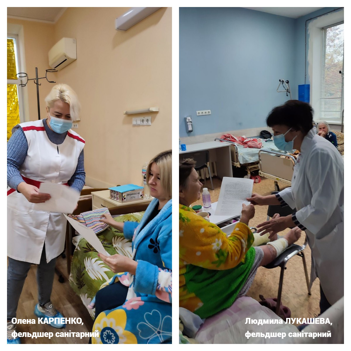 Під час інформаційних заходів були проведені бесіди з пацієнтами відділень та працівниками харчоблоку на теми щодо профілактики серцево-судинних захворювань, цукрового діабету, метгемоглобінемії, коронавірусної інфекції, онкозахворювань, тютюнопаління, ожиріння, отруєння грибами, туберкульозу, СНІДу, холери, шкідливих залежностей, а також щодо збереження ментального здоров’я.