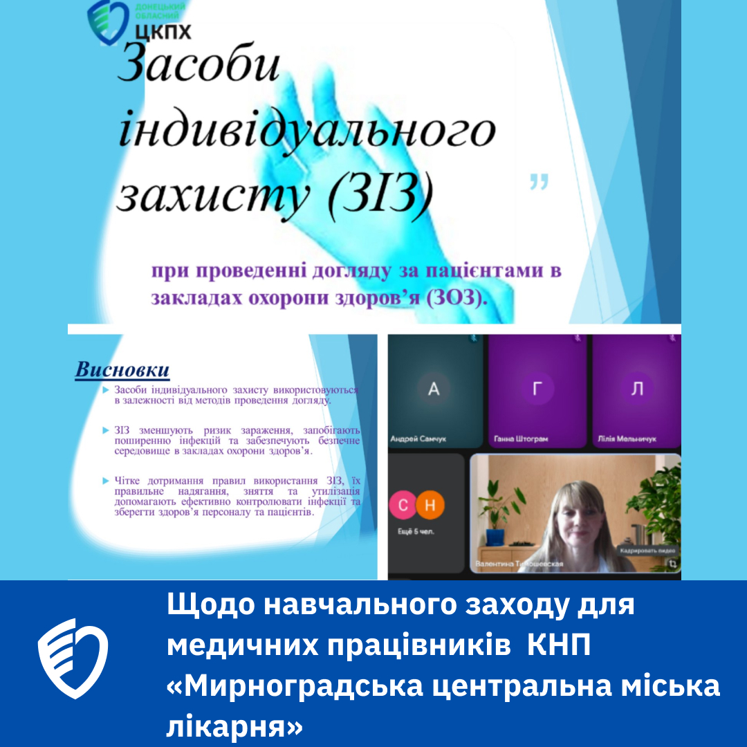 📅08.07.2025 фахівцем відділу антимікробної резистентності та інфекційного контролю ДУ «ДОНЕЦЬКИЙ ОЦКПХ МОЗ» для медичних працівників КНП «Мирноградська центральна міська лікарня» Мирноградської міської ради Донецької області був проведений навчальний онлайн-вебінар на тему: «Засоби індивідуального захисту при проведенні догляду за хворими в закладах охорони здоров’я».