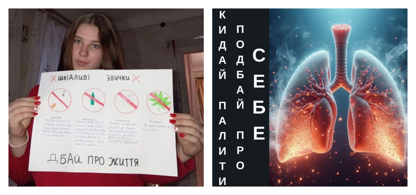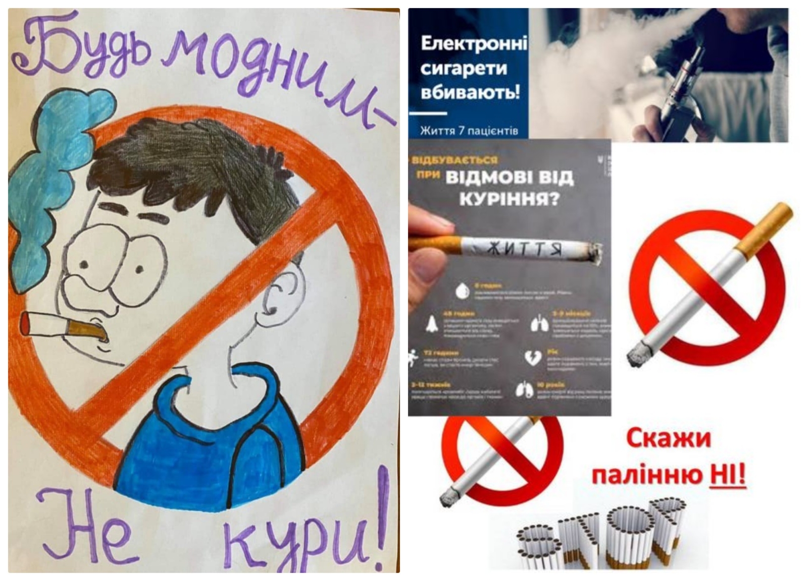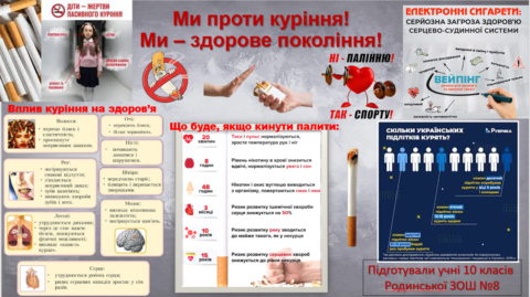 🔔Протягом листопада на сайтах закладів загальної середньої освіти, сторінках у Facebook закладів, а також у Вайбер-групах класів, були розміщені наступні інформаційні матеріали: 3 статті «Вживання тютюну – фактор ризику неінфекційних захворювань», «Небезпека вживання електронних пристроїв для куріння, «Що таке системи для нагрівання тютюну? Небезпека їх вживання. Кальян», 3 інформаційні картинки «Шкода кальянів», «Заборонено куріння, вживання та використання з 11.07.2022», «Заборонено продаж з 11.07.2023»; 2 відеоролика «No Smoking Friendly. Не будь байдужим — захищай своє право на бездимне повітря!» та «Марічка Падалко наголошує – безпечного куріння не існує!». Також здобувачі освіти створювали плакати на підставі картинок та ключових повідомлень, наданих фахівцями ДУ «ДОНЕЦЬКИЙ ОЦКПХ МОЗ».