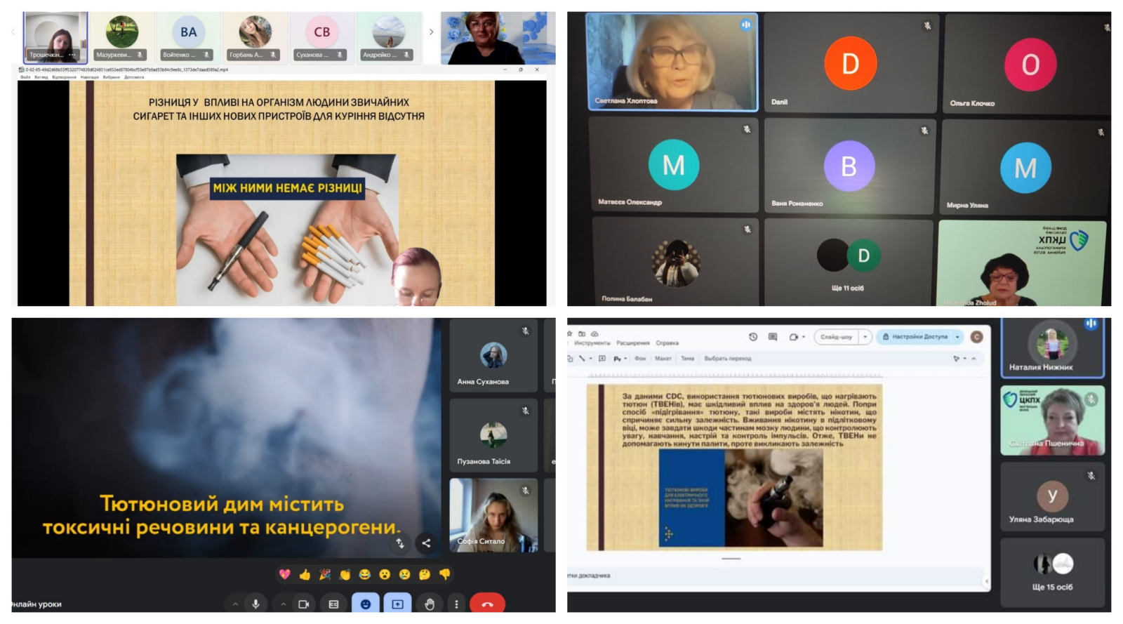 У першій декаді жовтня для учнів в онлайн-режимі проведено вебінар «Проблема тютюнопаління», до якого долучилися 628 учнів, 71 вчитель, 20 батьків.