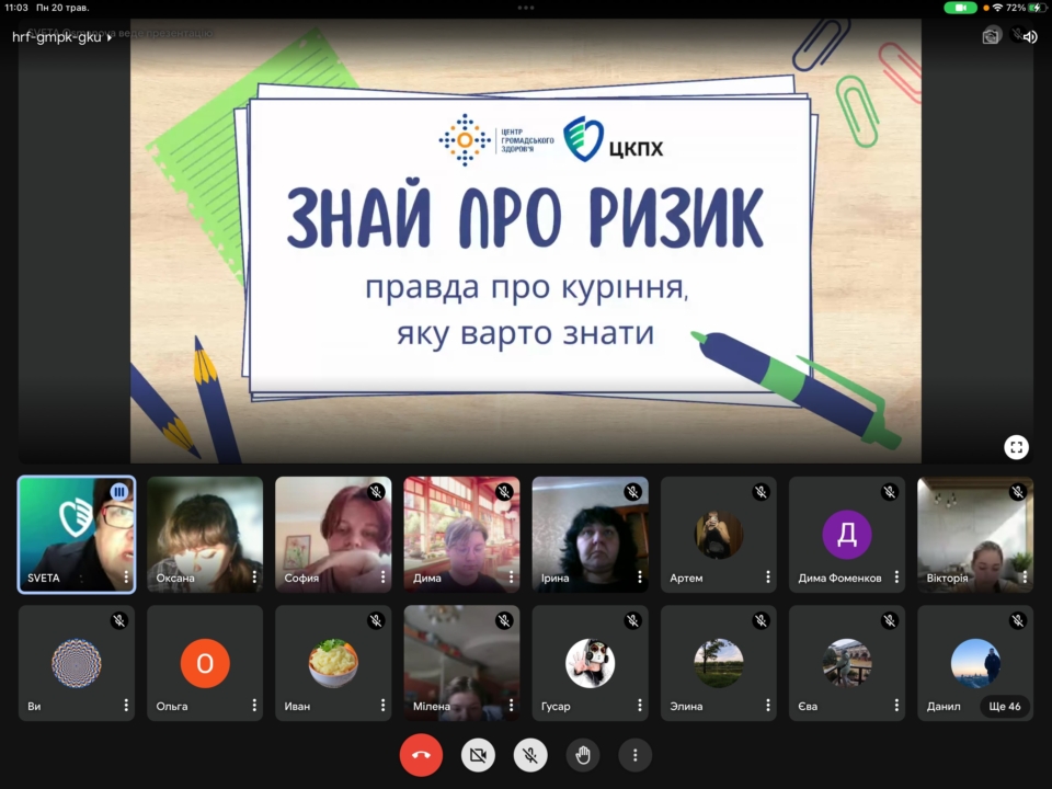 Для учнів 11 загальноосвітніх закладів (10 шкіл та 1 ліцей) у 8 населених пунктах Донецької області здійснювалися заходи, передбачені планом, а саме: фахівцями філій ДУ «ДОНЕЦЬКИЙ ОЦКПХ МОЗ» проведено онлайн – вебінари з презентацію “Знай про ризик – правда про куріння, яку варто знати”, що була представлена Державною установою “Центр громадського здоров’я Міністерства охорони здоров’я України». До вебінару долучилися 553 учня з 39 класів (7 клас – 2, 8 клас – 14, 9 клас – 8, 10 клас – 11, 11 клас – 4) та 37 вчителів.