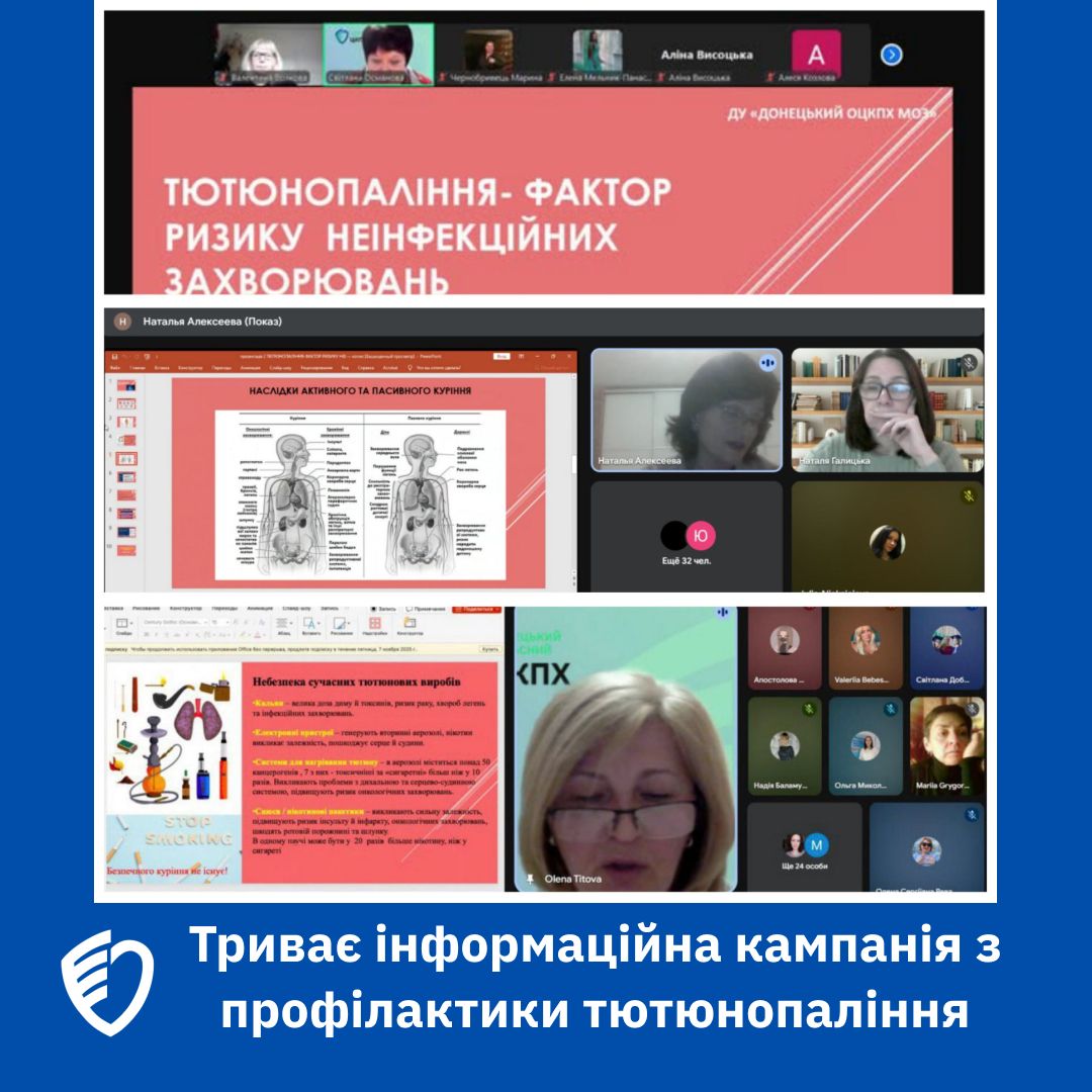 📣У межах інформаційної кампанії з профілактики тютюнопаління, ініційованої Державною установою «Донецький обласний центр контролю та профілактики хвороб МОЗ України» спільно з Департаментом освіти і науки Донецької обласної військової адміністрації, 4 листопада фахівці Центру провели другий онлайн-вебінар на тему «Тютюнопаління – фактор ризику неінфекційних захворювань» для учнів 9–11 класів КЗ «Маріупольська загальноосвітня школа І–ІІІ ступенів №10» та КЗ «Маріупольська загальноосвітня школа І–ІІІ ступенів №47» Маріупольської міської ради Донецької області, а також для учнів Волноваського опорного закладу загальної середньої освіти І–ІІІ ступенів Волноваської міської територіальної громади. Загалом у заходах взяли участь 130 учнів, 23 педагоги та 8 батьків.