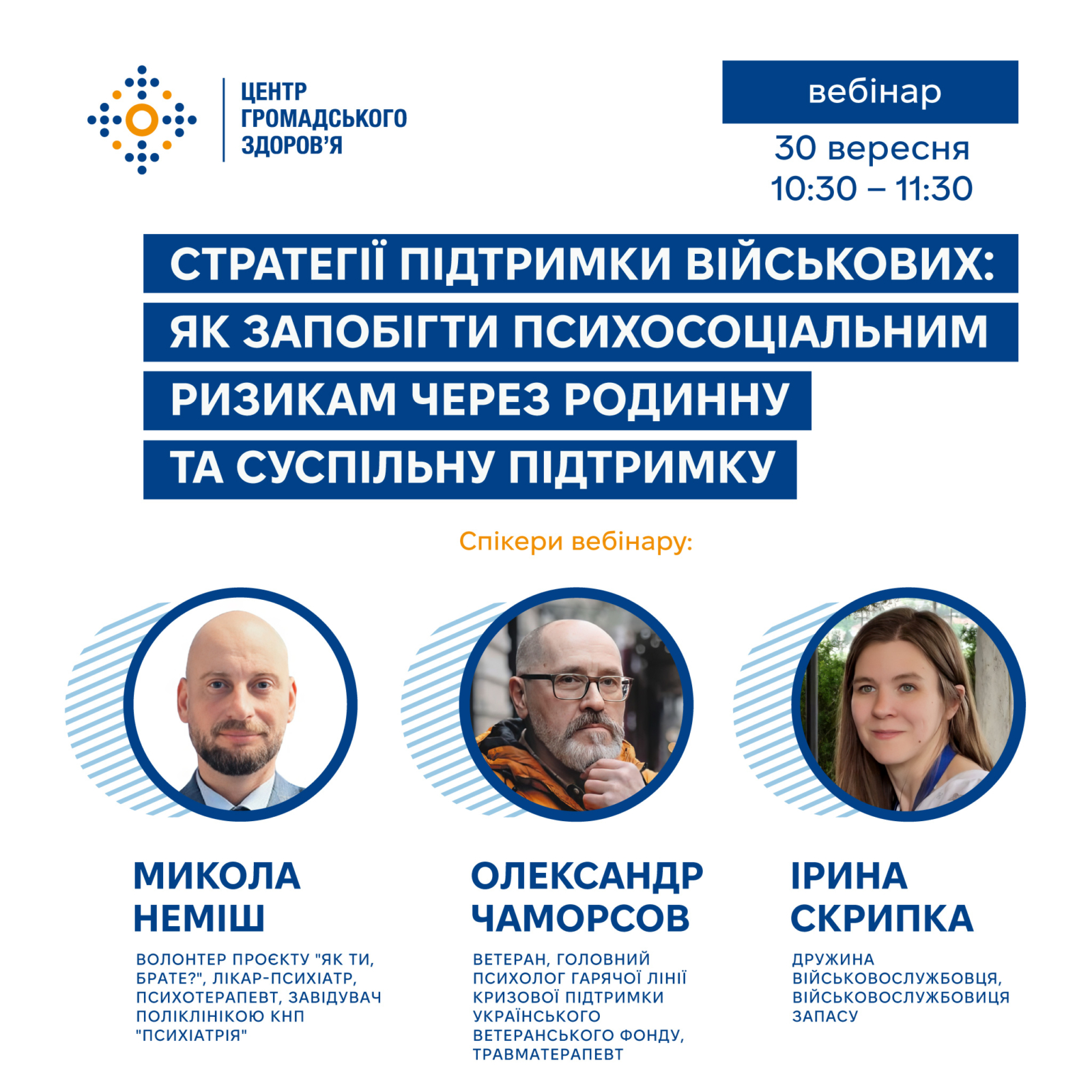 ➡️Центр громадського здоров’я запрошує працівників центрів контролю та профілактики хвороб (ЦКПХ), відповідальних за психічне здоровʼя, та всіх охочих взяти участь у вебінарі “Стратегії підтримки військових: як запобігти психосоціальним ризикам через родинну та суспільну підтримку”.