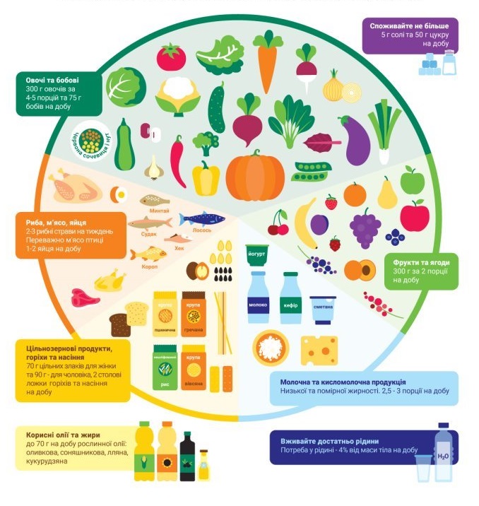 - Вживайте більше овочів та фруктів. Овочі та фрукти повинні складати 50% добового раціону. Необхідно вживати не менш 5 порцій овочів та фруктів щодня (400-600 г); 1 порція має важити близько 80 грамів; обирайте різноманітність та різнокольоровість (принцип «веселки»). Овочів 🍆🥔🥕повинно бути більше у раціоні, ніж фруктів 🍎🍒 (оптимальною кількістю є вживання двох порцій фруктів і трьох порцій овочів на день). Додавайте овочі та фрукти до кожного прийому їжі. Найкращий вибір – свіжі, заморожені або сушені овочі та фрукти.